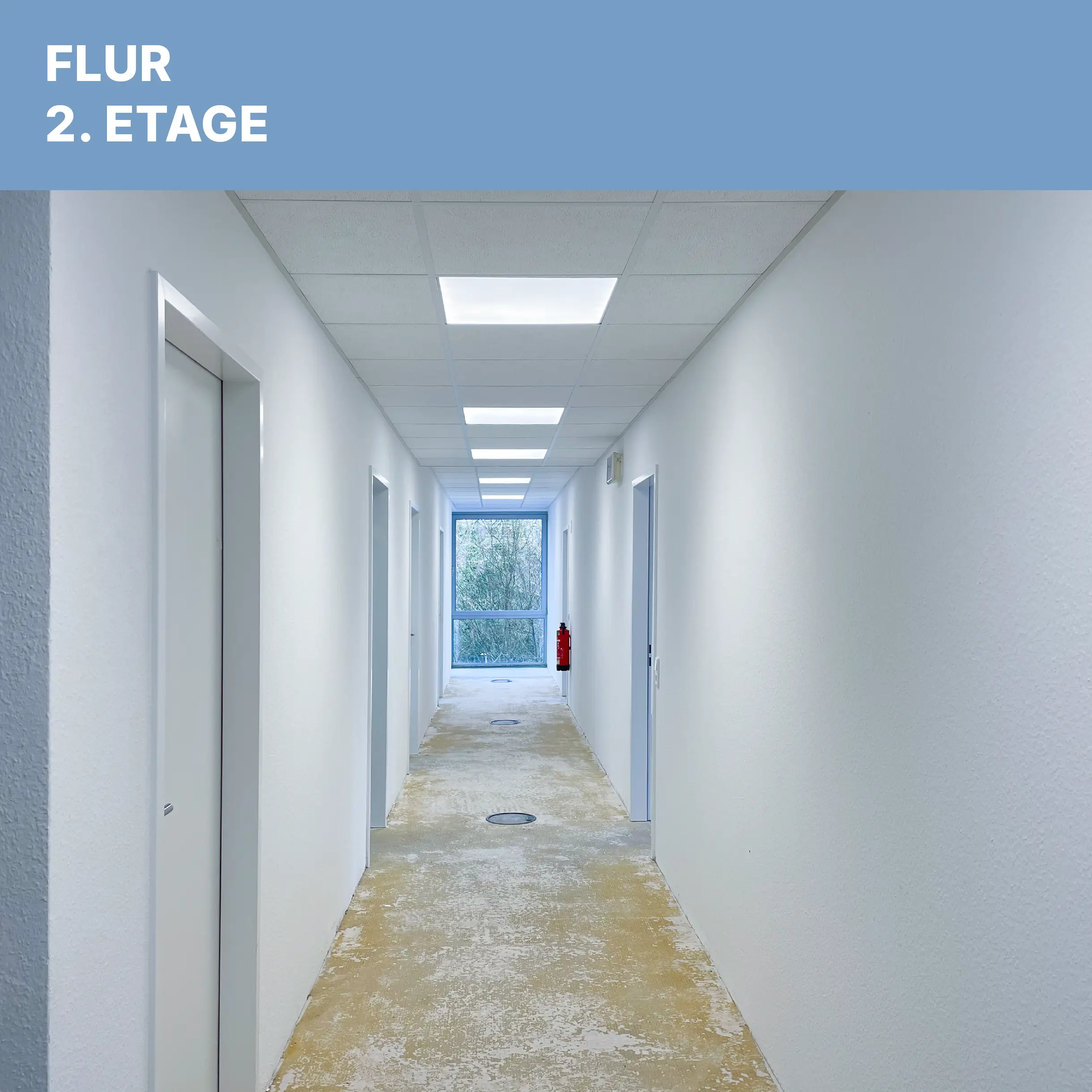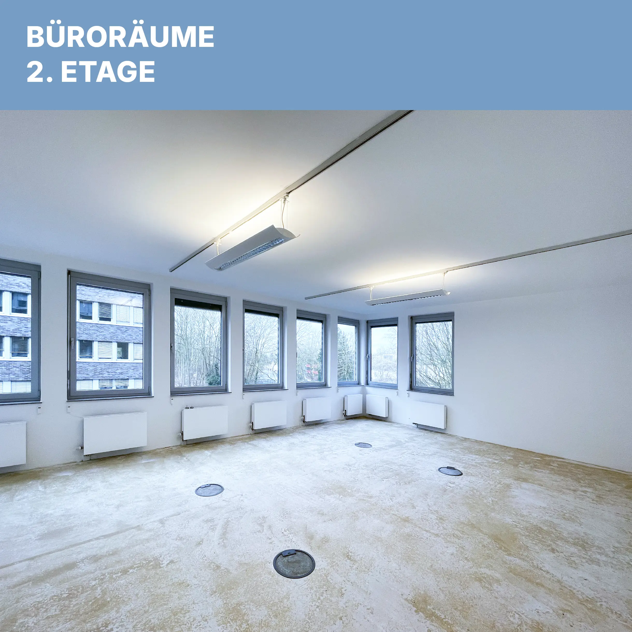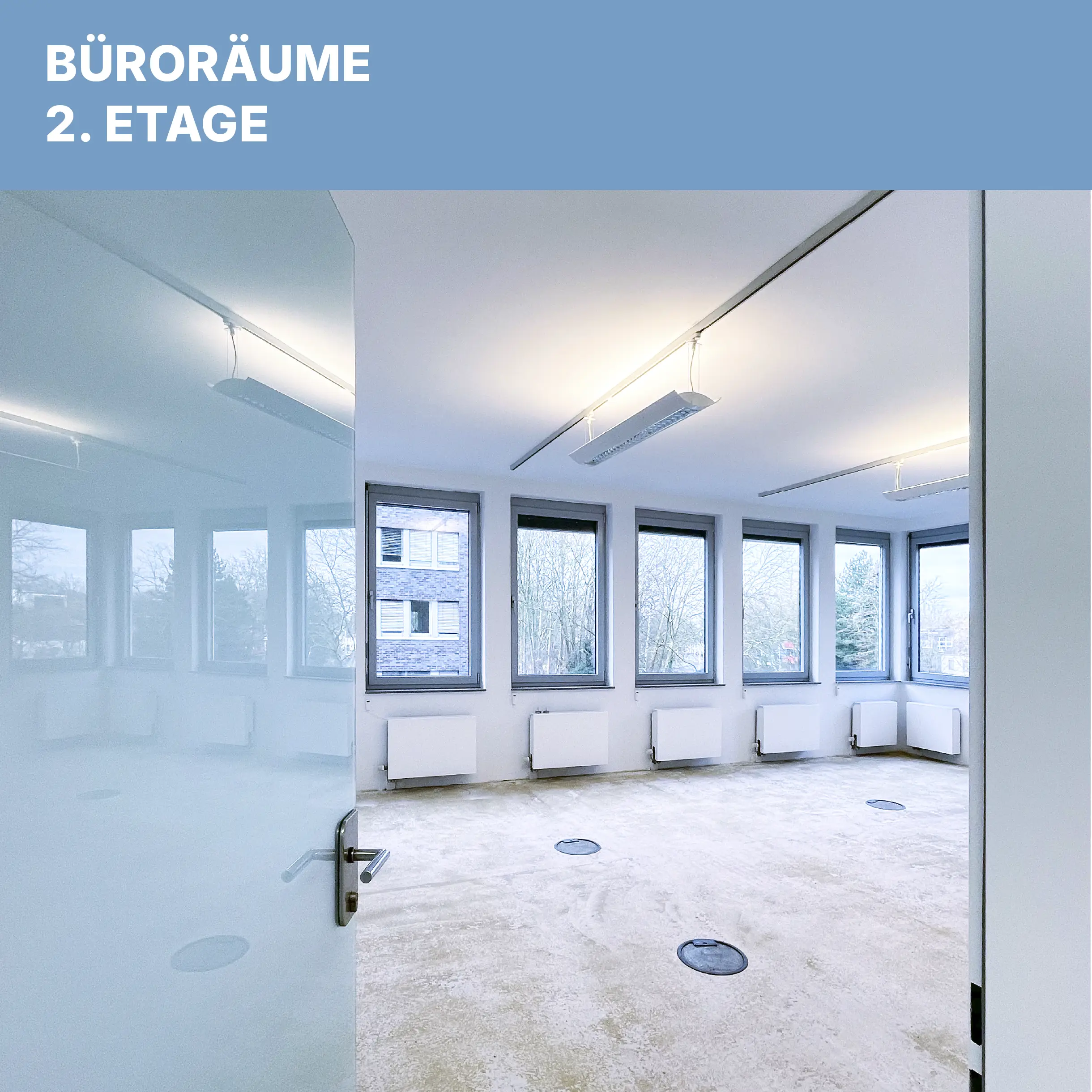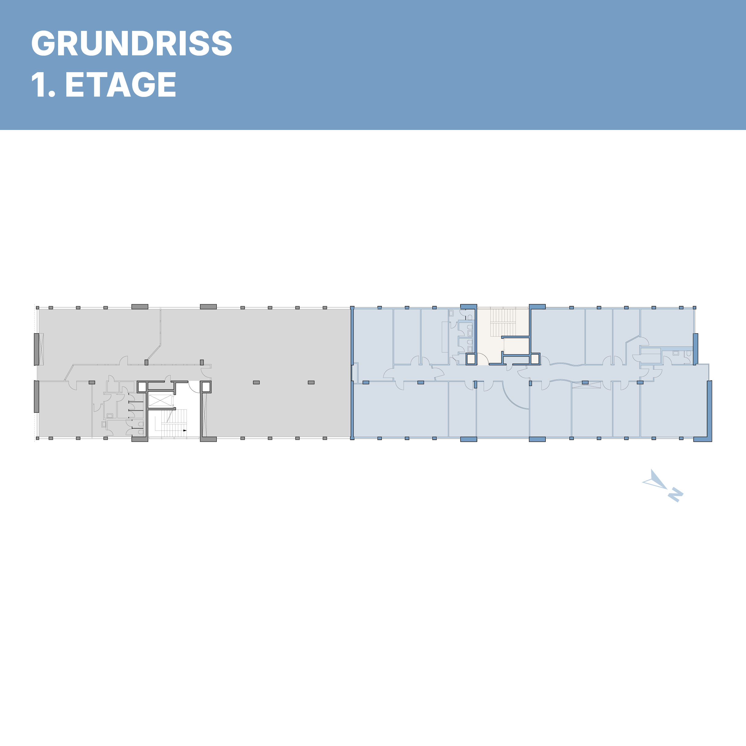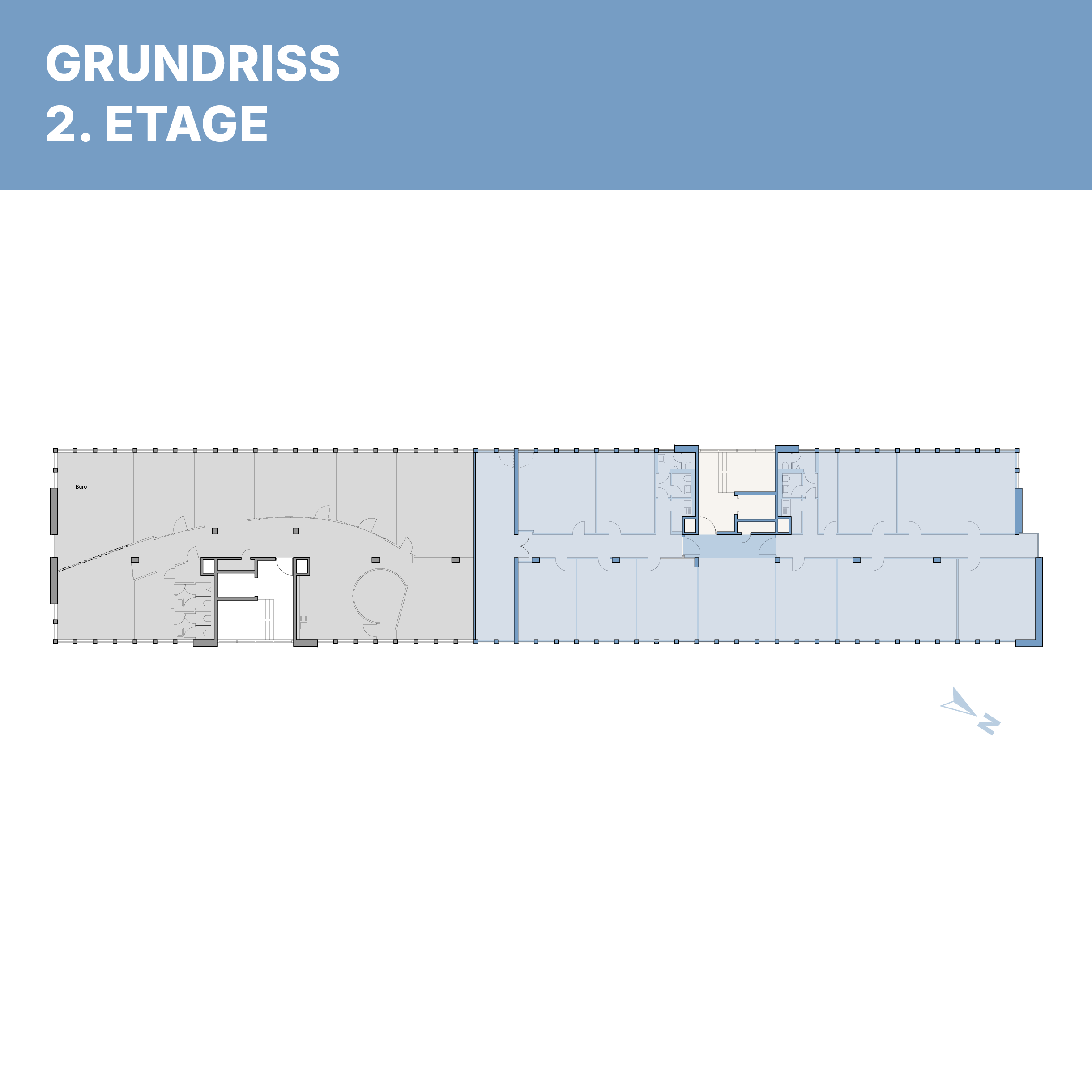 Derzeit stehen in dem 5-geschossigen Bürogebäude 2 Einheiten von jeweils einer halben Etage Umfang zur Vermietung. Die beiden Nutzungseinheiten (ca. 430 m² im ersten OG und ca. 467 m² im 2. OG) bieten jede Menge Platz für die Umsetzung individueller Ideen. Die Raumnutzung in den vorliegenden Grundrissen ist dabei nur beispielhaft und kann für die gewünschte Nutzung unter Umständen angepasst werden.